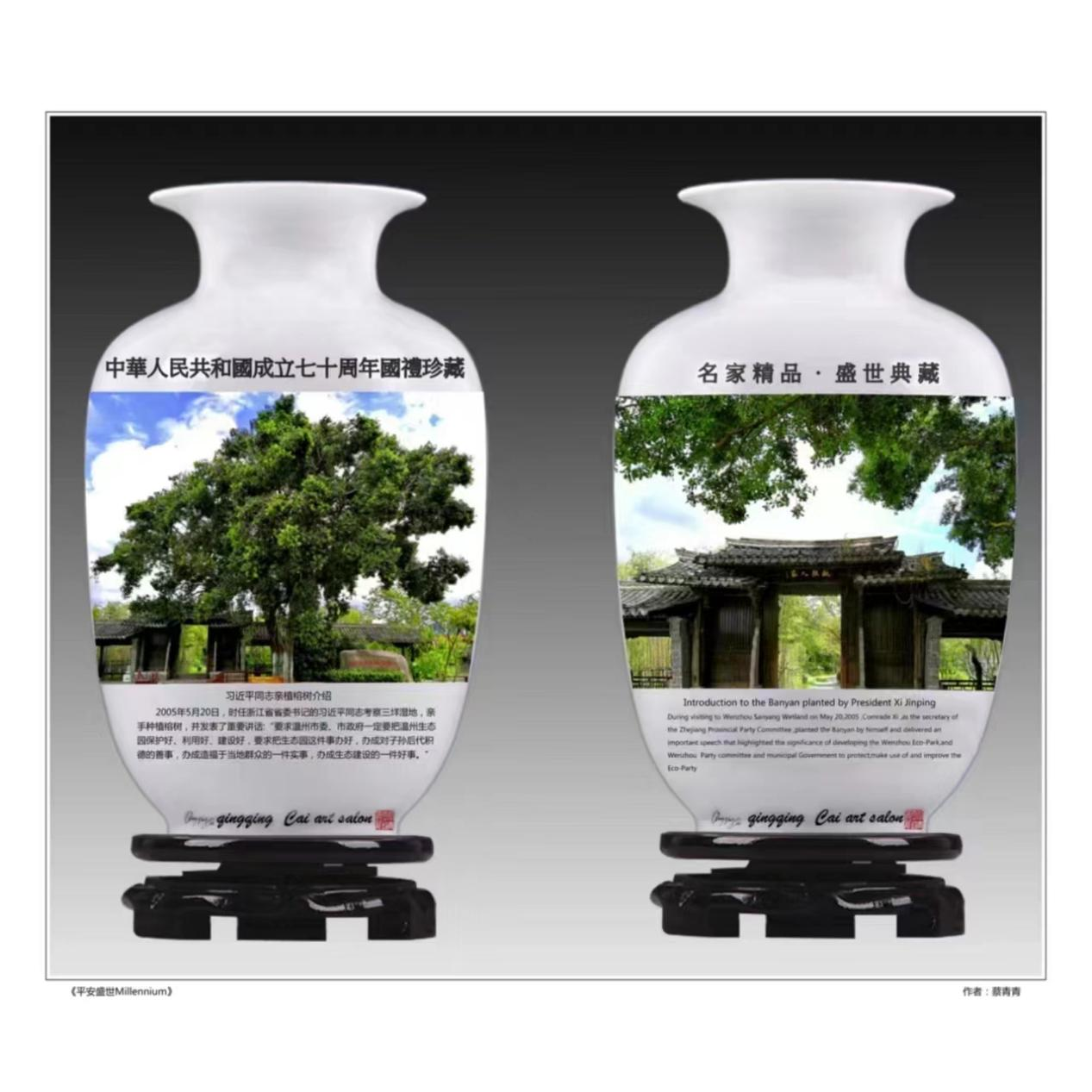 2019年9月,温州肯恩大学《庆祝中华人民共和国成立70周年》应邀在该校举办两人“书画摄影”联展,同时举行蔡青青《平安盛世》国礼珍藏景瓷瓶作品首发仪式!