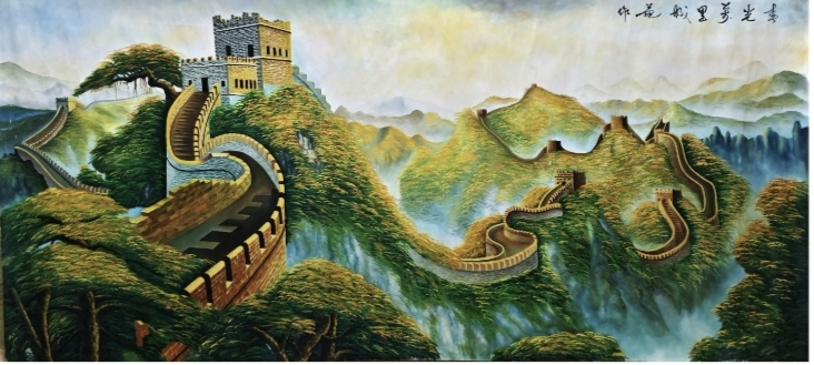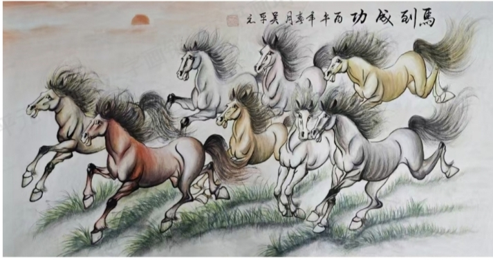 吴平元的绘画作品:包括长城,奔马,扇面,烙画等装饰性很强的作品在寻常百姓家大受欢迎。所以纵观他的作品,上能达象牙塔顶,下可以入寻常门第,雅俗共赏,由此可证;也唯有雅俗共赏,所以不必感叹三百年后的境遇景象,而是可以在当下的让丹青艺术呈现出盎然磅礴的艺术魅力。未来之功,更是不可限量!
